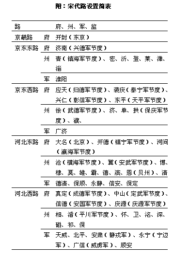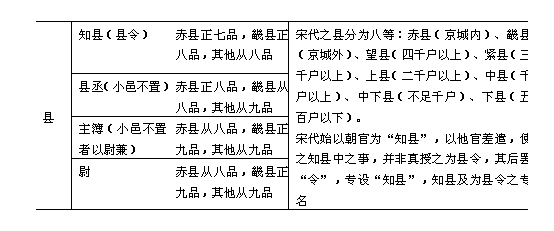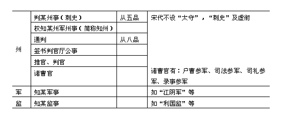 宋代的地方官制,初期基本上沿袭唐五代旧制。行政机构分州、县两级。宋太宗以后,又把全国分为若干路,路相当于唐代的道、元代的省。这就变成为路、州、县三级。 县是地方行政机构最低一级,自秦汉以后,历朝相沿不革。宋代的县,设县令、县尉,作为一县的长官。大县还设有主簿一员。《长编》卷11载,开宝三年(公元970年)规定县官的定制:“县千户以上,依旧置令、尉、主簿,凡3员;户不满千,止置令、尉各1员,县令兼主簿事;不满四百,止置主簿、县尉,以主簿兼知县事;不满二百,止置主簿,兼县尉事。”神宗熙宁以后,令二万户以上的县增置县丞一员,县丞次于县令而位在主簿、县尉之上。南宋时则取消县丞。宋制县的长官称县令。但往往看到史志记载多称为知县,这是宋代地方官制的特点。知县就是知县事的简称。据《长编》卷4载,宋代为了加强对地方政权的控制,从乾德元年(公元963年)开始“命大理正奚屿知馆陶县、监察御史王祐知魏县、杨应梦知永济县、屯田员外郎于继徽知临泛县。常参官知县,自屿等始也。”这是由皇帝直接委派京官带本官去掌管一县之政,即所谓知县事,也就是一县的主要长官。知县有别于县的本官县令,因为是差遣。 州等于秦汉时的郡,隋唐以后改称为州。州的长官,隋唐皆设刺史。赵匡胤立宋初年,鉴于唐末五代之患,削州镇之权,“令文臣知州事”,其后,派二品以上的官员充任一州的长官;主要也是为了便于皇帝的直接控制。为了更有效地加强控制,又设通判与知州相互牵制、监督。《长编》卷4载,宋太祖乾德元年(公元963年)“始命刑部郎中贾玭等通判湖南诸州”,当时因为湖南刚刚平定,多留用后周时的旧官员,于是宋太祖才命刑部郎中贾玭等通判湖南诸州,意在控制这批留用官员。后来发展成为牵制、监视州府长官的一种定制。《宋会要辑稿·职官》卷47说:“通判,州各1人,与长吏均理,州府之政,无不统治,藩府或置两员,广南小州有试秩充通判兼知州者。”又云:“知州,掌郡国之政令,通判为之贰。”通判这种官的权位有些特殊:论官位,通判在知州之下,仁宗以前规定,朝官充通判者,历两任即可升为知州,天圣六年(公元1028年)改为三任方得充知州;论职权,则通判不但可与知州同理一州之政(州府公事须经知州与通判签议连书方许发下,凡兵民、钱谷、户口、赋役、狱讼听断之事,与守臣通判签书施行),而且,作为皇帝的耳目,所部官有功过及职事修废,可直接通达皇帝。因此不能简单地认为通判就是知州的副职,当时人视之为“监州”,则更符合其身分。 宋代以府、州、军、监并称。大体说,凡政治、经济、军事三者兼重的地方设府,有驻重兵的军事地区设军,工业区如煮盐、冶铁等重要地区设监。府的地位比州略高一些,因此,稍大的州,则多升为府,升府的州,一部分是沿袭唐五代旧名,一部分是因为皇帝未即位时所封或曾是任官之地。派往知府者一般都是比较重要的官员。 军在唐代是一种军区,只管兵戎,五代以后,逐渐与行政区没有多大差别,至宋代则成为兵、民、军、政合一的行政区域。凡是唐代节镇所在仍保留其军号,也有加给新改的军号,这种称为节度州。但另有一种称军的地方,不是节度州,而是由县升的,或领数县,或并不领县。这种军往往仅比县略高一级。设军的地方,一般是在边境,也有是在关隘要地。宋太宗时期,军的建置最多,总共有34个,其中在河北、陕西与契丹、西夏接壤的边境所建置的就有15个。在边境地区设军,是为了适应制御外敌的需要,而在内地的关隘口设军,则主要是为了易于弹压兵民的叛乱。例如彭州灌口镇(今四川彭县),乾德四年(公元966年)置永安军,后一度废为县,太平兴国三年(978年)改称永康军,据《长编》卷274载,其批文称“永康军正控两山六州军隘口,昨据张商英奏请废为导江县。若非军官,实不足弹压,可令复旧。”五代的军,治所与县治同处一所,而隶属于州;宋代因削藩镇兵权,取消支郡制度,于是军便得与州府并列。至于监,实际上与县差不多,但因其直属京师,不为州县所辖,因而也同列于州。监亦有领县者。府、军、监的设官,大体与州相似,《神宗正史职官志》说:“知州事,通判州事各1人,府、军、监事如州,视地望重轻,以资级应选省充。” 为了统治的便利,宋代还把全国分为若干路。今据《宋史·地理志》所载,并依《太平环宇记》、《元丰九域志》校补,制成“宋代行政区域表”。路的建置是依据元丰时设置的23路,加上徽宗崇宁时重设的京畿路,共24路。
