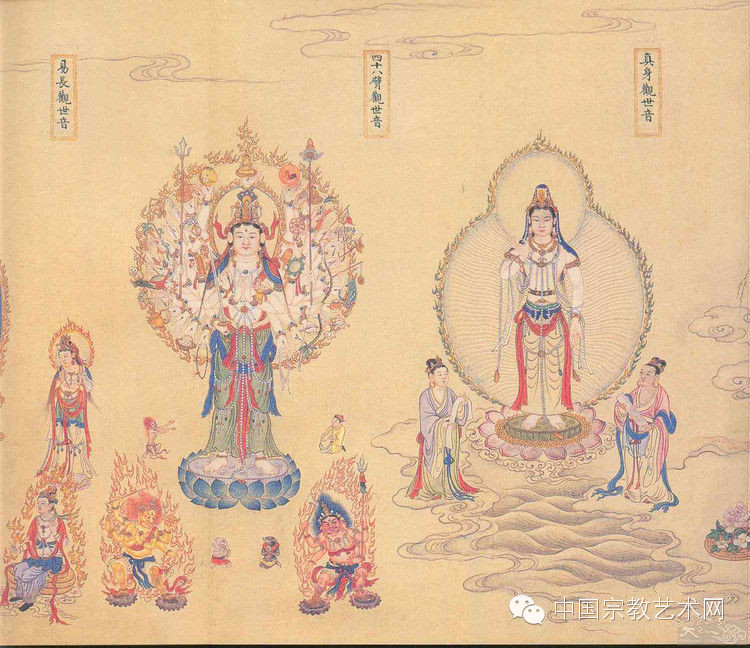 笃信佛教的乾隆皇帝对《大理国梵像卷》极为爱惜,命当时宫廷画家丁观鹏,在“四大活佛”之一的章嘉国师指导下重新整理和临摹,对《大理国梵像卷》进行勘误,将神像及人物的名位和序列重新排列。这项集佛学、艺术、历史及民俗研究的重大工程,历时数载,至乾隆三十二年(1767)完成,题为《法界源流图》,里面共绘制典故98组,千手观音、财神、形态各异的十八罗汉、神像630多尊,每一尊都有一重福佑,以及龙凤虎狮等吉祥神兽50多种、亭台楼阁、山水花草等,展现了富贵吉祥、福寿安康的美景。